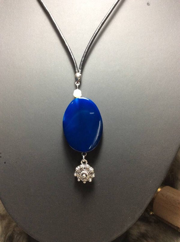 Hanger van halfedelsteen in de kleur diep blauw, met Zeeuwsknopje en klein zoetwaterpareltje